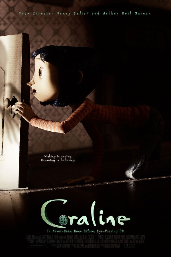 Wandering her rambling old house in her boring new town, 11-year-old Coraline discovers a hidden door to a strangely idealized version of her life. In order to stay in the fantasy, she must make a frighteningly real sacrifice.