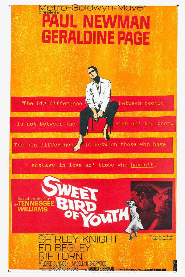 Gigolo and drifter Chance Wayne returns to his hometown as the companion of a faded movie star, Alexandra Del Lago, whom he hopes to use to help him break into the movies. Chance runs into trouble when he finds his ex-girlfriend, the daughter of the local politician Tom "Boss" Finley, who more or less forced him to leave his daughter and the town many years ago.