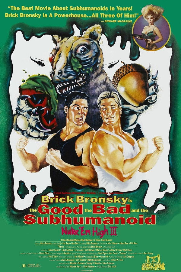 It's the final chapter in the cult classic Class of Nuke'Em High Trilogy, and this time the fate of Tromaville hangs in the balance! Following the destruction of the Nukamama Power Plant by the lovable and horribly mutated toxic squirrel Tromie. Roger Smith (Brick Bronsky) and his half-subhumanoid son Adlai (also played by Brick Bronsky) are working to rebuild Tromaville into a place where human and subhumanoid can live together in peace. Unbeknownst to them, Adlai's twin brother Dick (again played by Brick Bronsky!), kidnapped at birth and raised by the evil Power Clite, has plans to regain contol of the Subhumanoids and turn Tromaville into a nuclear waste dump. In a showdown for the ages, "The Good, the Bad and the Subhumanoid" face off in an explosive sci-fi battle of epic proportions!