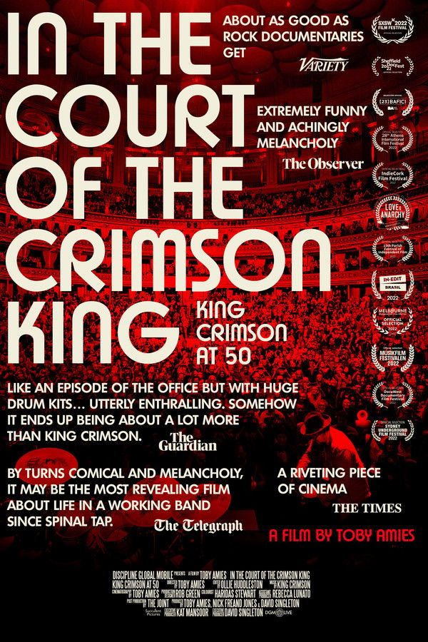 The film explores the “acute suffering” and transcendent glory experienced by current and former members of King Crimson, allowing the audience an intimate and sometimes uncomfortable insight into the musicians’ experience as they confront life and death head on in the world’s most demanding rock band.