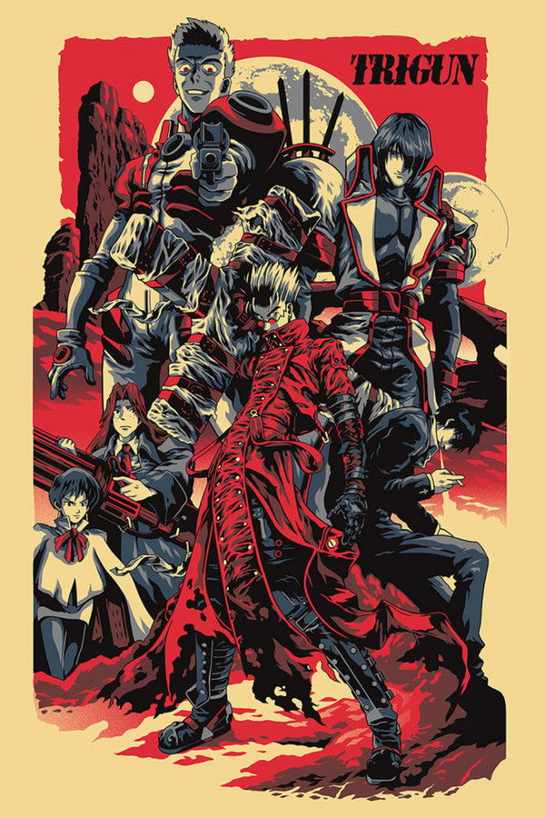 Trigun takes place in the distant future on a desert planet. Vash the Stampede is a gunfighter with a legend so ruthless he has a $$60,000,000,000 bounty on his head. Entire towns evacuate at the rumor of his arrival. But the real Vash the Stampede, the enigmatic and conflicted lead character, is more heroic, even though he usually acts like a complete idiot.